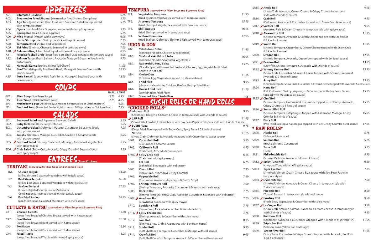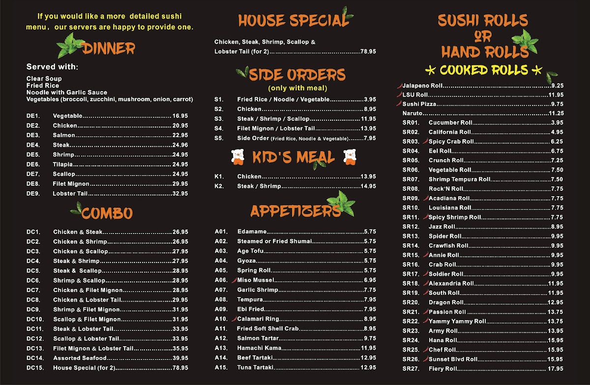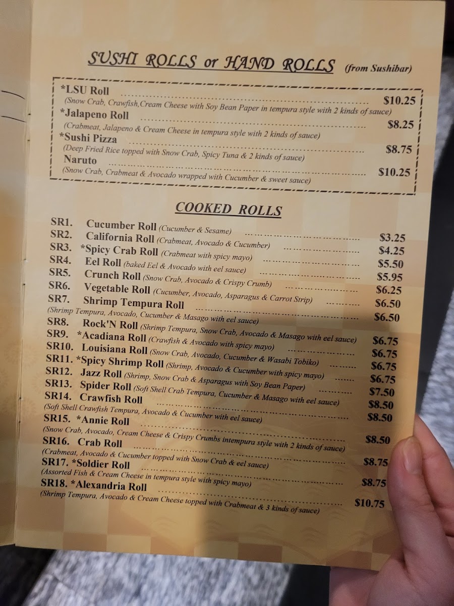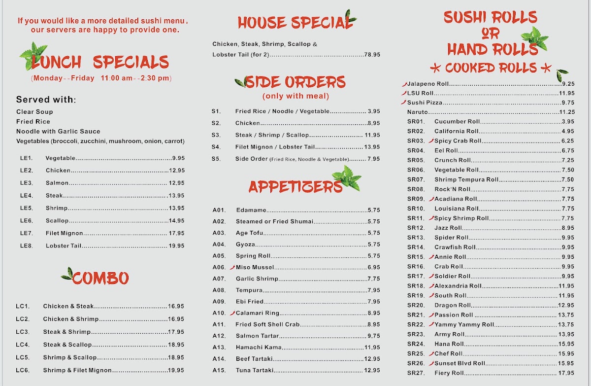Hana Alexandria, located at 2915 S MacArthur Dr in Alexandria, LA, is a culinary gem that offers a vibrant sushi experience. Customers rave about the exceptional service and welcoming atmosphere, making each visit memorable. The menu features a delightful array of sushi rolls, with highlights including the Chef roll, Geisha roll, and the nationally acclaimed LSU roll. Diners appreciate the generous portions and freshness of ingredients, particularly the seafood. Notable dishes like the wasabi-infused sushi and snow crab salad showcase authentic Japanese flavors. Whether you're celebrating a special occasion or simply indulging in a delicious meal, Hana Alexandria guarantees an enjoyable dining experience.